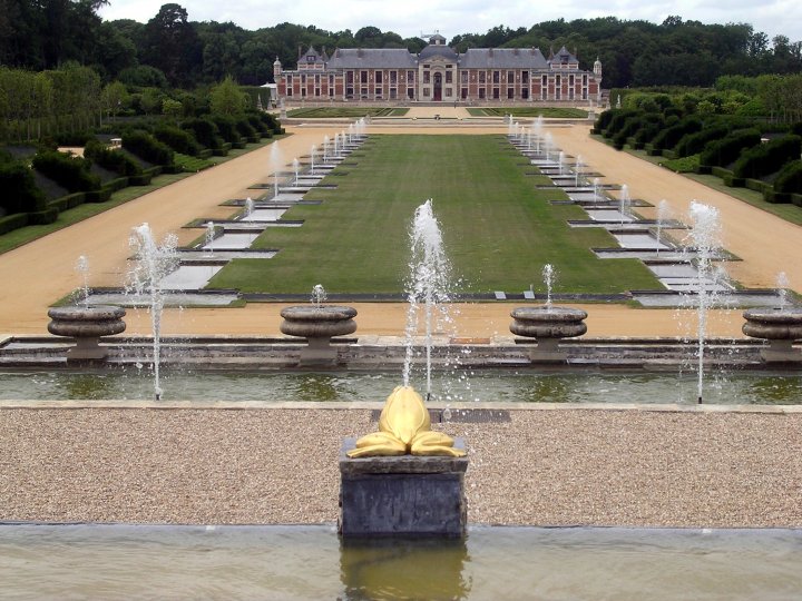 Sympa cette grenouille dorée (ou crapaud ?) qui semble - par son jet d'eau - diriger le spectacle d'un jardin "aquatique" mettant en valeur le château.