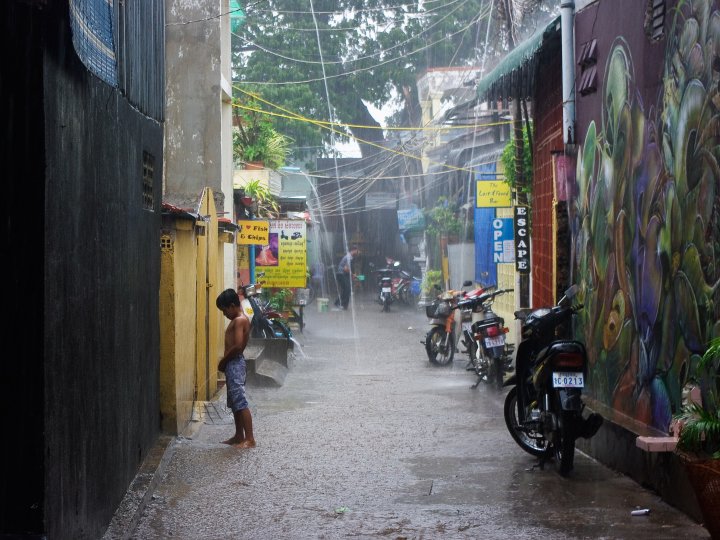 Scène cocasse au détour d'une rue lors de la mousson (Phnom Penh, Cambodge)