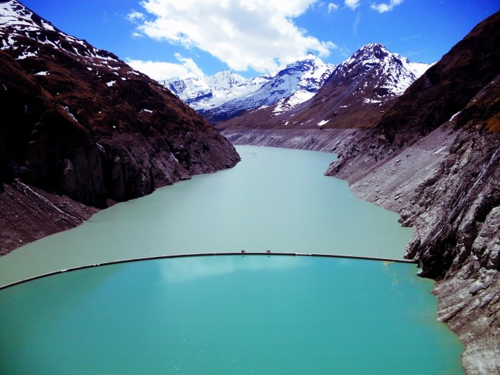 Barrage de la grande Dixence (Suisse) avec le vieux barage de la Dixence qui sépare les deux bassins ce qui donne un contraste de couleurs entre les température différentes de l'eau. Géniale.
