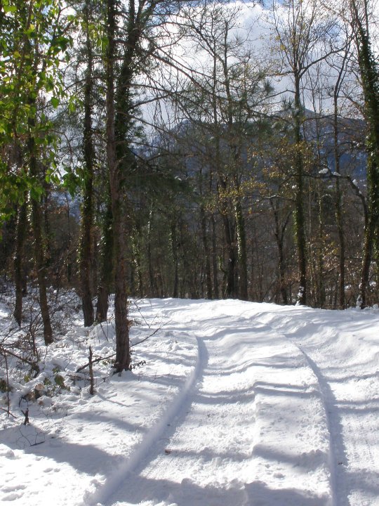 Route bien enneigée. L'orginalité de ce cliché tient dans le fait des feuilles vertes aux arbres en même temps que la neige !