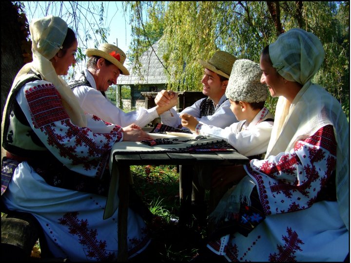 Moment de repos lors d'un festival de folklore, deux pères s'amusent. Photo prise à Targu-Jiu en Roumanie dans le musée du village ou les musiciens, habillés en tenue folklorique se reposaient en jouant avant une séance photo et enregistrement musical. Pour mieux preciser l'endroit, la ville de Targu-jiu est reconnue pour ses sculptures monumentales de Brancusi si fameux dans le monde de la sculpture (musée Beaubourg). Un endroit peu visité par un tourisme culturel... bien dommage