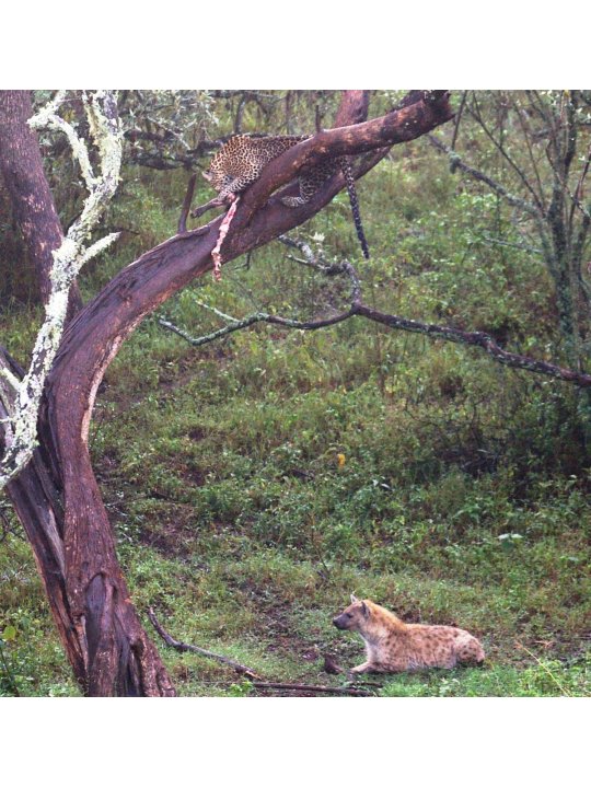 belle scène de vie sauvage : la panthère en train de festoyer dans l'arbre et la hyène qui attend les restes éventuels. Par contre dommage que le plan rapproché est au détriment de l'arbre qui est le thème du mois.