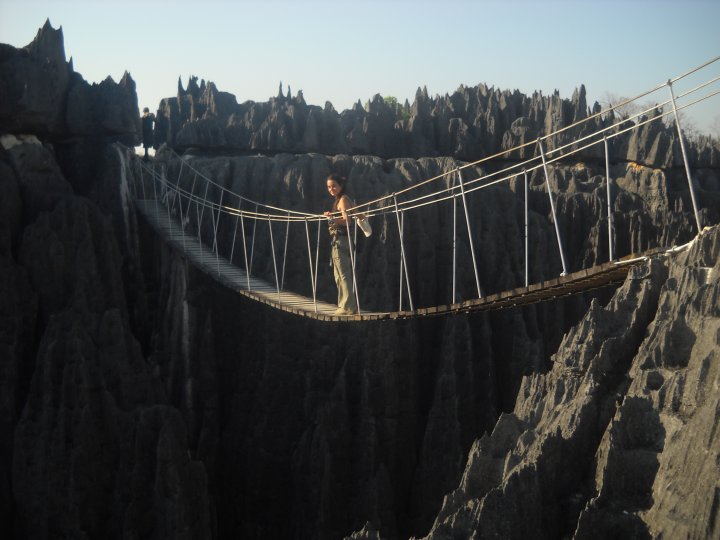 Me voilà, traversant le Parc National des Tsingy à Madagascar ! Ascension de quelques heures (avec baudrier) pour une étape sportive et une vue panoramique de l'île. :)