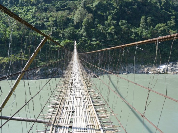 Pont de bambous tressés dans l'état indien d'Arunachal Pradesh, le seul moyen pour traverser cette rivière.