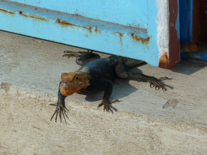 Gros lézard au Bénin, appelé Agame. Ces "bébêtes" super rapides vous passent sous les pieds en marchant dans la rue....grrrrr. Il y en a partout, dans les buissons, sur les trottoirs, dans les jardins !! J'ai réussi à en photographier une sur le pas de la porte d'une échoppe, avant de vite m'écarter ;o))