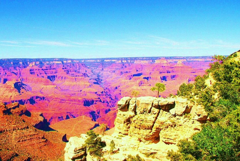 Prise de vue du Grand Canyon dans l'Arizona, au fond la rivivère Colorado. Les couleurs étaient impressionnantes et irréelles. Il y avait des condors de Californie mais ils n'ont hélas pas voulu poser en même temps pour la photo !