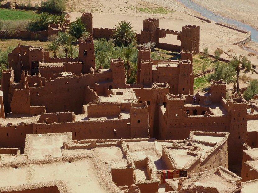 Ksar d'Aït-Benhaddou, au Maroc. On a tendance à entendre aussi le terme de Kasbah, pourtant Aït-Benhaddou est bien un Ksar : c'est à dire un groupement collectif de "maisons" ou "cellules" familiales appelées Kasbah, à l'intérieur de fortifications. Ce site est inscrit depuis 1987 au patrimoine mondial de l'Unesco. Les chercheurs ne sont pas d'accord quand à la date de construction, entre le VIII et le XIIième siècle a priori. A la base, une trentaine de familles y vivait, mais désormais, seule une dizaine y habite toujours. Les autres ont rejoint l'autre rive et le nouveau village. Ce site magnifique est également un lieu privilégié pour le tournage de film :les diamants du Nil, Lawrence d'Arabie, Gladiateur, Astérix et Obélix mission Cléopâtre,... J'ai choisi ce point de vue qui ne montre pas le Ksar dans son intégralité, mais permet de visualiser 2 kasbash en assez bon état sur la droite, d'autres plus abîmées sur la gauche(à cause des fortes intempéries), et les toits-terrasse au premier plan, caractéristiques de ce genre d'habitations. Bref, un lieu du Maroc à ne pas manquer ;o)