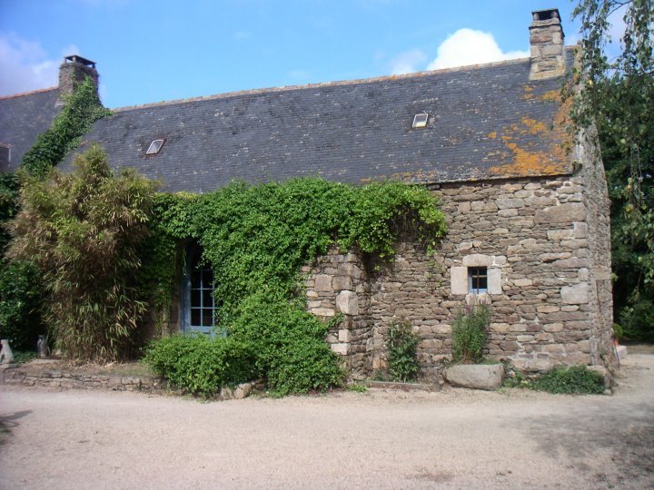 Maison bretonne typique des fermes avec son auge. Ces maisons en pierre furent un temps délaissées. Elles sont aujourd'hui très prisées, habitées et gardées dans le plus pur style d'antan. On remarquera le pot à lait en fer blanc sous la verdure. Les fenêtres et lucarnes sont petites pour ne pas laisser entrer le vent et la pluie.