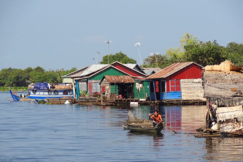 Lors de la traversée en bateau sur la rivière reliant Siem Reap à Battambang au Cambodge, nous avons croisé, au milieu de nulle part, quelques villages flottants comme celui-ci. Chaque villageois possède sa propre pirogue pour se déplacer au gré de ses besoins et envies.