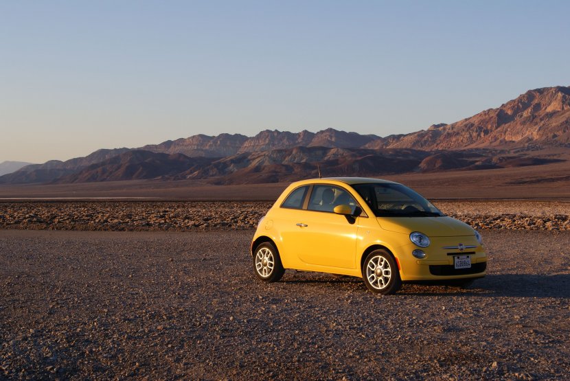 Notre Fiat 500 Jaune de location en août 2011, photographiée devant le Devil's Golf Course dans la Vallée de la Mort en Californie, USA