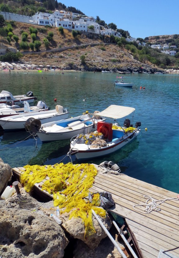 Un bateau de pêche avec ses filets exposés aux rayon du soleil. Lindos, petit port de l'Île de Rhodes.