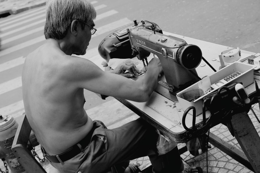 Photo prise à Saigon. Pour la petit histoire, ma pochette où je range mes biens persos avait un jolie trou. Je rencontre cet homme pour me le faire recoudre et au moment de le payer, l'homme me dis "c'est cadeau ! pour l'amitié ". Très belle rencontre de voyage.