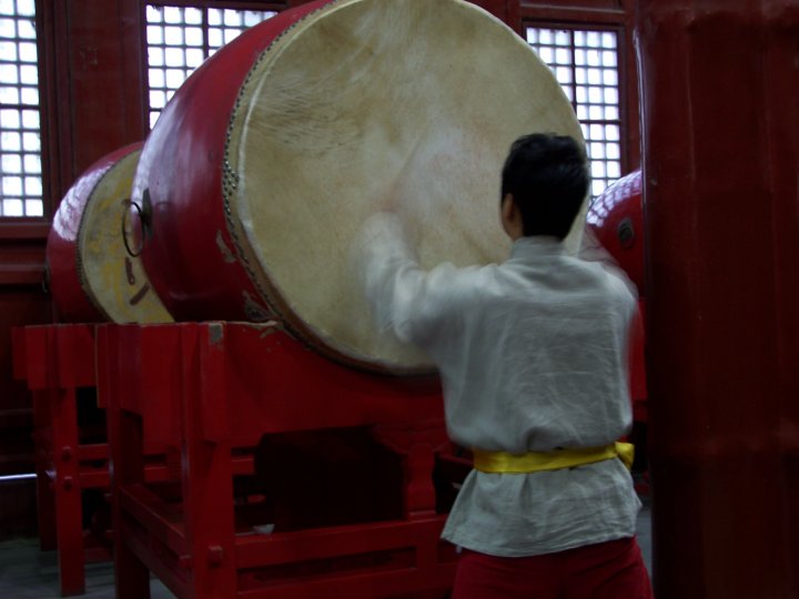 Photo prise lors d'une démonstration de tambours à l'étage supérieur de la tour du Tambour (Pékin, Chine). A l'époque des Ming (15e siècle), les gardes marquaient le temps grâce aux tambours toutes les deux heures. En effet, dans la culture chinoise, la journée était divisée en douze périodes de deux heures, ce qui correspondait aux douze animaux du calendrier chinois.