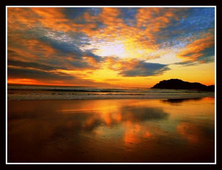 Jolies couleurs cuivrées pour un coucher de soleil très réussi où la plage les vagues et le ciel se confondent !!!