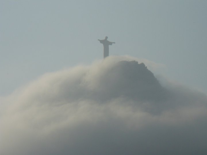 Splendide vue de notre chambre d'hôtel, le Corcovado dans les nuages. Brésil, Rio de Janeiro, octobre 2007.