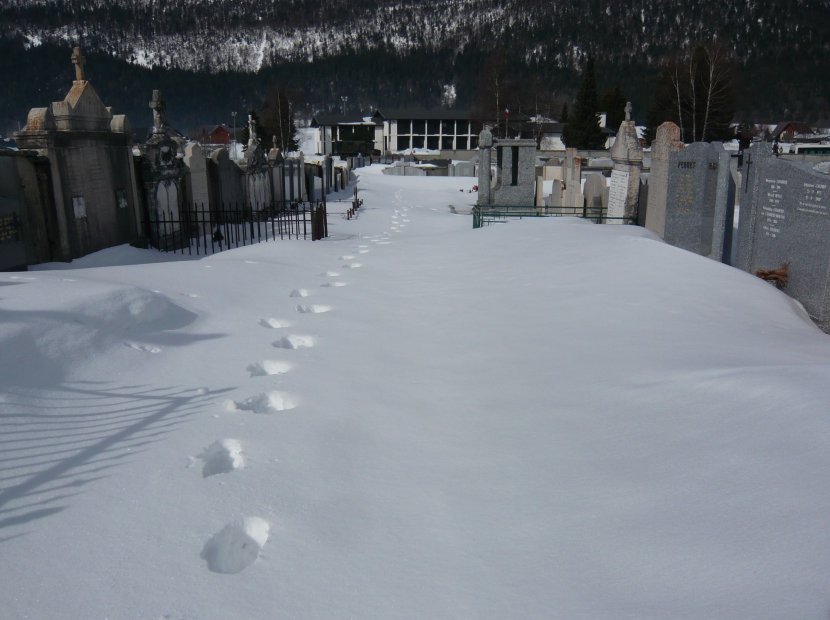 signalez un problèmetout comme Paul , j'ai de suite interprété ces marques de pas dans la neige fraîche , comme ceux de la Mort venant visiter ses ouailles. Si ce cliché, original par ailleurs, jette un froid, c'est bien vu de la part de Bernard , car total respect du thème imposé ! Moi , les cimetières, me laissent "froide".