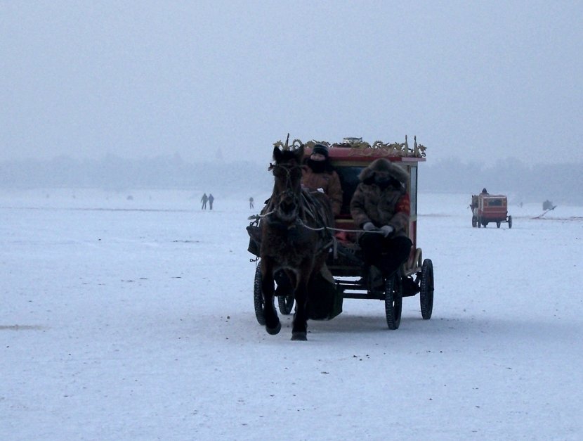 Harbin (Chine), Ville de Glace, attire une foule de touristes chinois et étrangers en hiver... surtout à l'occasion de son célèbre Festival de sculptures sur glace et sur neige. A cette occasion, le fleuve Songhua (d'où est extraite la matière première des sculptures) devient un véritable terrain de jeux : patinage, luge... et promenades en calèches. Météo de la prise de photo, le 07. 01. 2013 : brouillard, environ -30°C.