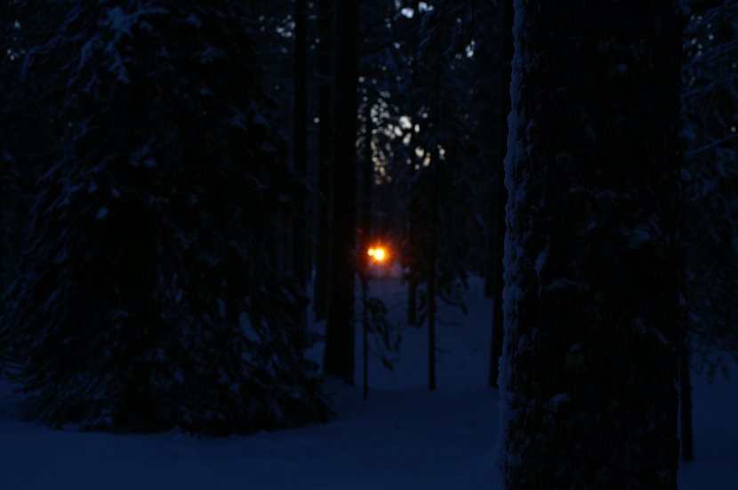 Il est 14h00 et le soleil se couche dans cette forêt lapone, car nous sommes en janvier, près du cercle polaire arctique en Finlande. A cette période ses rayons n'apparaissent que 4 heures par jours. La température avoisine les -20°C.