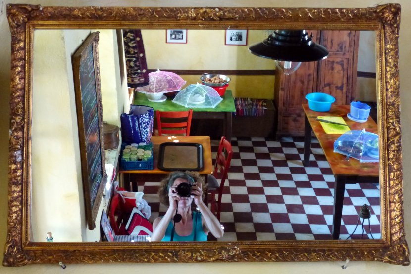 Un détail qui détaille et qu’il faut détailler : Livaniana de Paleochora, petit village crétois, à 300 m d’altitude. Nous sommes ici dans la toute petite école, qui est restée fermée de 1933 à 1993, puis a été rénovée en un petit bar-resto très sympathique. La vue sur les montagnes depuis sa très agréable terrasse ombragée est magnifique, le jus d’orange fraîchement pressé, le café grec ou les cafés frappés y sont délicieux. De bonnes odeurs du déjeuner qui se prépare chatouillent les narines… Alors, petit coup d’œil à l’intérieur : voici l’ancienne et unique salle de classe, qui jouxte la minuscule cuisine (l’ancien bureau du maître d’école). C’est coloré, les ingrédients de l’incontournable salade grecque, fraîchement lavés, émincés, attendent, sagement protégés sous cloches, ainsi que des pots de miel que l’on peut acheter. Le carrelage en damier, l’armoire, témoignent du passé. Cette glace aussi était là, à l’époque où il s’agissait ici d’étudier. Elle a attiré mon regard…