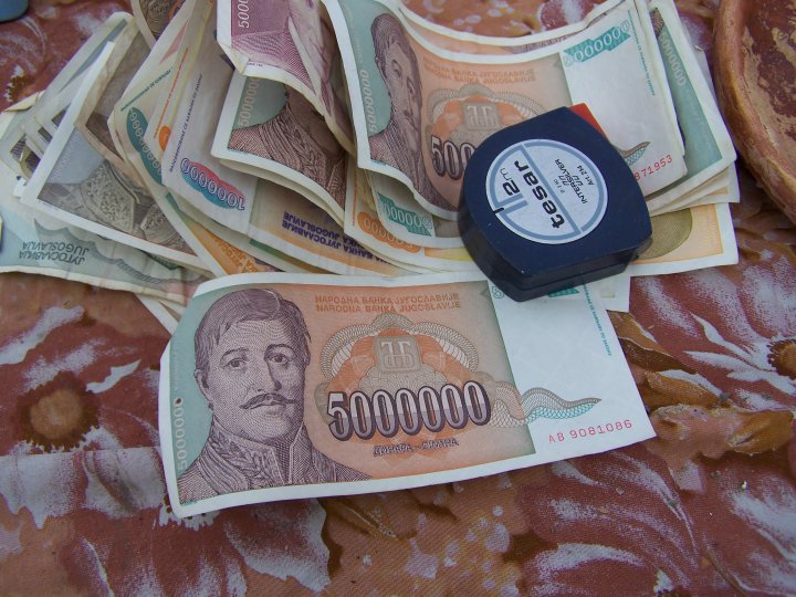 Un gros plan pour vous faire voyager dans l'espace et dans le temps ! Il était une fois un vaste territoire nommé "Yougoslavie", où le (bien aimé) Papa "Tito" avait instauré un communisme original ; ce grand pays finit pourtant par se disloquer et susciter de terribles évènements : nationalisme, guerre, hyperinflation etc. Ces billets (photographiés dans un marché très fréquenté par les Roms) témoignent du triste sort qu'ont dû subir les populations habituées à un tout autre confort à l'époque du Maréchal prônant l'union de "six Républiques, cinq nations, quatre langues, trois religions, deux alphabets et un seul parti"... Gros plan sur un "détail" historique, politique, économique, géographique, géopolitique, sociopolitique... [Les frontières des champs de recherche peuvent être aussi floues que les terrestres.]Mais qu'est-ce qu'un détail ?! Voici une humble contribution à un thème intéressant mais difficile !