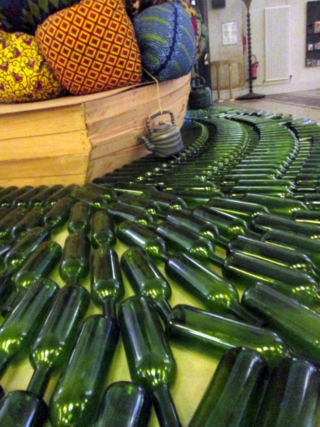 "BARQUE EN BOIS, BALLOTS DE TISSUS, BOUTEILLES" de Barthélemy Toguo, Musée de la Porte Dorée (Paris). Je cite (à peu près) l'explication écrite à coté : "La vie et l'oeuvre de Barthélemy Toguo interroge sur le statut de l'étranger, du migrant et pose la question de l'Autre... Cette Barque de l'exode plonge dans l'épreuve de la traversée en haute mer sur la houle précaire d'une vague de bouteilles vides...". Un commentaire bien emphatique mais ne croyez pas que je me moque. Vue dans son ensemble, l'oeuvre est agréable à regarder et l'astuce amusante. Cependant dans le hall du musée, le regard perçoit d'abord un tapis de bouteilles vides... tout à fait insolite. Porte Dorée, est-ce "voyage" ? oui... il y a une barque.