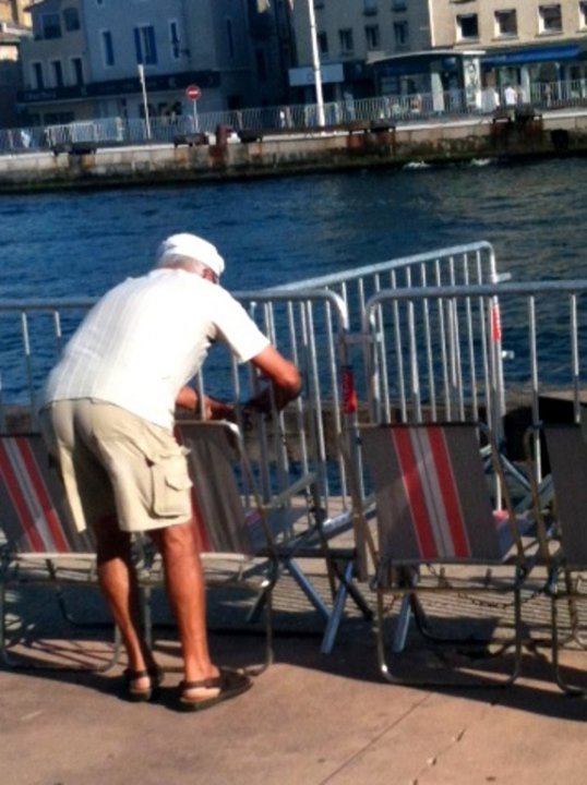 06 juillet 2013 à Martigues dans le cadre de Marseille capitale européenne de la culture aura lieu ce soir sur les canaux un grand spectacle pyrotechnique (épisode trois des Révélations organisées par le groupe F). Mais que fabrique ce Papé au milieu de l'après midi? Il attache ses chaises avec un cadenas aux barrières de sécurité. Nous l'apercevrons le soir avec toute sa petite famille, confortablement installé aux premières loges; nous debout dans la foule, serrés comme des sardines... Excuser la qualité de la photo elle à été prise avec un vieux tel portable.