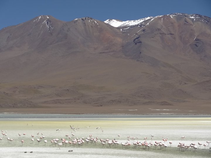 C'est vrai qu'ils sont un peu rose pâle nos petits flamands, mais j'aime le contraste de leur taille et fragilité le contraste avec l'énorme montagne derrière.