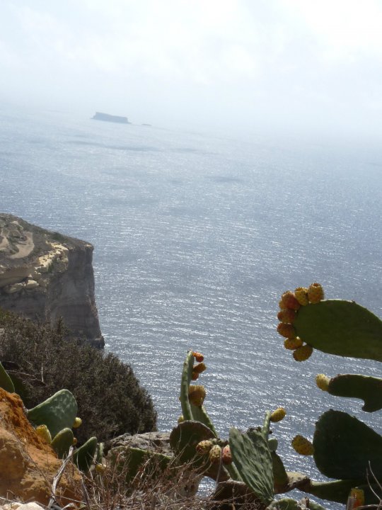 Sur les hauteurs des falaises de Dingli (Malte), le fond de mer brumeux enveloppent les cactus de douceur