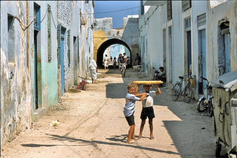 J’ignore dans quel état est arrivé cette baguette chez le destinataire mais en tous cas elle a fait la joie de ces deux petits bonshommes.. Plusieurs fois tombée par terre elle aura certainement fait grincer des dents par la suite... Ruelle de Kerouan... (scan diapositive).