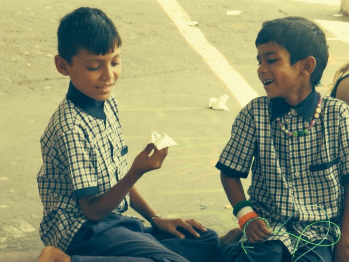 Un cliché touchant avec ces deux enfants qui semblent heureux de s'amuser avec cette cocotte en papier, bien vu.