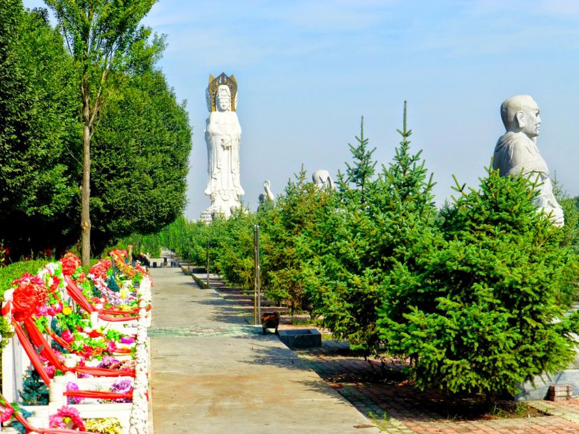 Ce matin, je roule à vélo dans la province chinoise du Xinjiang, à une centaine de kilomètres à l'est de Ürümqi. De gros embouteillages se forment à l'entrée d'un parc. Je suis tout d'abord attiré par une immense statue, et d'autres plus petites qui se détachent sur un ciel bleu azur. Ce Mercredi 21 août 2013 c'est la Fête des Fantômes affamés. Elle a lieu le 15e jour du septième mois lunaire. Les esprits qui ne reçoivent pas de culte, ou ne peuvent trouver la paix pour cause de mort violente ou de mauvaise conduite, ces "esprits orphelins et fantômes sauvages" se voient offrir ce jour, des repas réconfortants et des cérémonies pour leur délivrance. Les tombes sont toutes couvertes de couronnes de fleurs et d'offrandes. Toute la journée, les familles se succèdent dans le cimetière. Une halte improbable sur ma route de la soie...