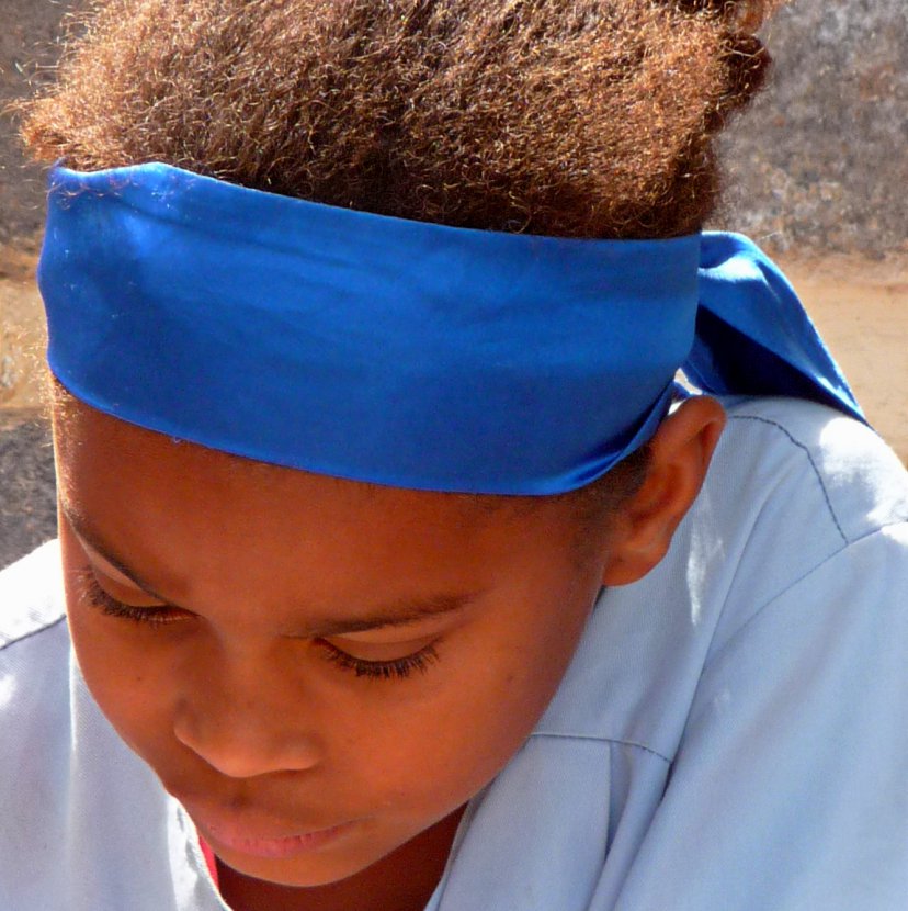 Sur l'île de Santo Antão, au Cap Vert, les enfants de le "petite école" (primaire) portent tous des blouses bleu ciel pour aller en classe. Cette jeune et charmante demoiselle s'était ce jour-là coiffée d'un bandeau assorti.