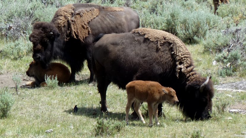 Parmi un troupeau de bisons que nous avons pu observer dans la vallée de Lamar (Parc de Yellowstone, USA), j'ai distingué 2 femelles avec leurs petits. On peut remarquer le contraste entre le pelage des petits, plus clair et à l'apparence plus douce, et celui des adultes, brun foncé et en train de muer.