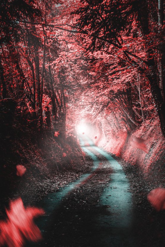 signalez un problèmeSi on recadrait cette photo par le haut, on aurait presque l'impression d'être dans un tunnel routier, à cause du rouge, du sentier bleu qui a un air d'asphalte mouillé. Original, sans plus.