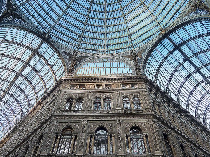 Sous le ciel bleu napolitain, flânerie dans la "Galleria Umberto 1er". Le nez en l'air pour ne pas manquer toutes ces lignes, ces courbes, ces envolées vers l'azur. Le risque était de buter dans les passants, ça n'a pas manqué mais j'ai quand même évité le torticolis.