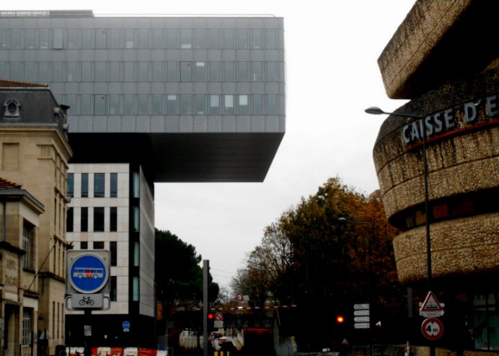 Architecture bordelaise moderne : Chacun sait que Bordeaux "vaut le voyage" pour ses vins et pour le cachet 18° siècle de la façade des quais sur la rive gauche de la Garonne. Qu'en est-il des réalisations modernes ? La Cité municipale, récemment inaugurée, est une ode à l'angle droit et au cube. Œuvre de Paul Andreu (Architecte de Roissy et de l'Opéra de Pékin). L'ensemble bien que mastoc à une certaine élégance mais je n'apprécierais pas d'avoir un bureau à l'extrémité du porte-à-faux. Diamétralement opposé dans le carrefour (autant que dans l'inspiration) le siège de la Caisse d'épargne, tout de rondeurs et de rocaille, est un des exemples les plus aboutis de l'Architecture organique, œuvre d'Edmond Lay. Depuis 40 ans, les bordelais trouvent que c'est une horreur, ce qui n'empêche ni son inscription au titre des monuments historiques, ni le projet de le transformer en hôtel de luxe.