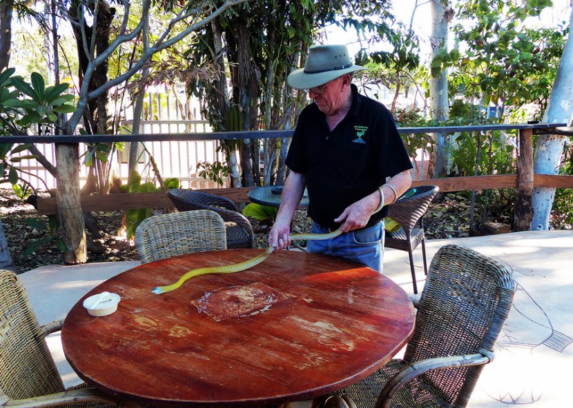 Région de Darwin, prés du National Park de Kakadu. Le LAZY LIZARD TAVERN, construit en briques produites à partir de la boue de termitières géantes , est un bar restaurant dans l’outback. Nous prenions un rafraîchissement sur la terrasse quand un membre du personnel nous a demandé si nous voulions voir un serpent ......................... C'est l'Australie !!!