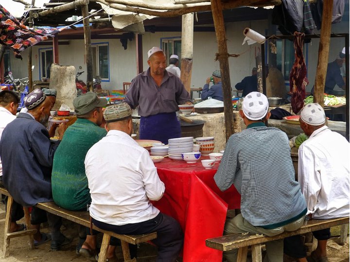 Sur ma route de la soie, après avoir parcouru aujourd'hui plus de cent kilomètres, me voilà rendu à Kashgar. Cette ville située à l'ouest du désert du Taklamakan, au pied des montagnes du Tian Shan, m'a toujours fait rêver, au même titre que Boukhara, Samarcande, Turfan et quelques autres. L'oasis de Kachgar se trouve au point de rencontre des routes nord et sud qui contournent le désert de Taklamakan. La ville de Kashgar est notamment réputée dans la région pour son marché du dimanche, réputé le plus gros marché d'Asie centrale. Situé à quelques kilomètres du centre ville, c'est toujours à vélo, que je m'y rend le lendemain de mon arrivée. Les commerçants, les éleveurs, les grossistes de tous les pays aux alentours, Kazakhstan, Tadjikistan, Kirghizistan, Afghanistan, Pakistan se pressent pour faire de bonnes affaires. A l'heure du déjeuner, tous se retrouvent dans une des nombreuses gargotes. Seul étranger occidental, j’apprécie tout particulièrement cette ambiance, cette atmosphère du bout du monde... Je passe à table !