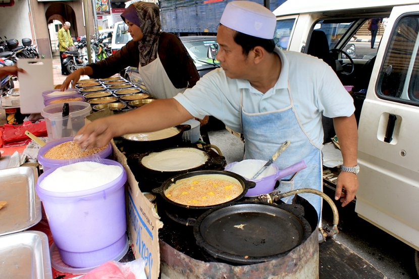 Préparation de crêpes malaise, sur la rue Jalan Tun Perak. Kuala Lumpur/Malaisie.
