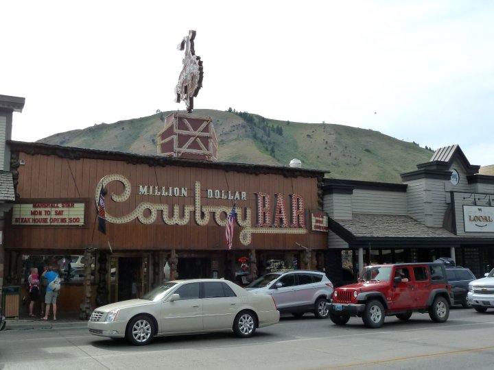 Million Dollar Cowboy Bar est un bar célèbre de Jackson Hole (ville d'environ 10 000 habitants de l'ouest du Wyoming située à l'extrême sud du Parc national du Grand Teton qui est lui-même au sud du Parc de Yellowstone). La décoration intérieure du bar est remarquable : sièges en forme de selles de cheval, têtes empaillées d'animaux, fond de musique country ... J'en ai eu un aperçu depuis la porte car nous étions avec nos petites-filles et l'entrée du bar est interdite aux enfants.