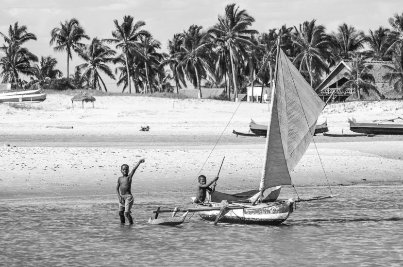 Jeunes malgaches apprenant à naviguer sur une embarcation bricolée avec les moyens du bord dans la région côtière de Morondava. Ils rejoindront bientôt leurs ainés pour partir accomplir une tradition ancrée dans l'essence même du peuple Vézo de Madagascar : la pêche.