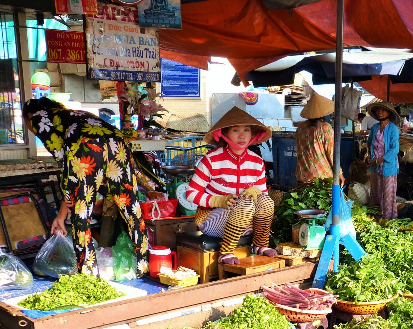 Un marché vietnamien où l'on peut en voir de toutes les couleurs, aussi bien dans les tenues vestimentaires que sur les étals.