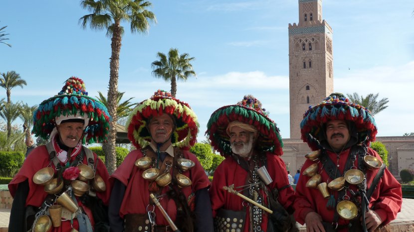 Ces "porteurs d'eau" prennent la pose en échange d'un euro ou quelques dirhams pour les touristes vers la mosquée Koutoubia à Marrakech. On peut les rencontrer également sur la place Jamaâ El Fna. Leurs larges chapeaux de paille garnis de pompons de laine multicolores attirent l'attention. Ils vivent maintenant du tourisme mais sont les témoins d'un vieux métier, portant sur eux une outre en peau de chèvres, des gobelets en cuivre ou en fer blanc qui leur permettaient de désaltérer les gens.