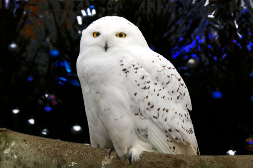 Chouette Harfang des neiges. Cette photo a été prise lors de la fête des lumières de Lyon (8 décembre 2014). On peut apercevoir dans le fond les décorations des sapins de Noël déjà installées.