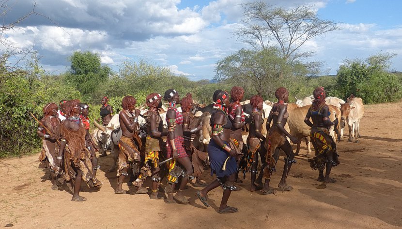 Ethiopie, vallée de Lomo. Chez les Hamer, l'Oukouli est une cérémonie d'initiation qui accompagne le passage d'un adolescent à l'âge adulte. Le jeune homme, nu, doit franchir quatre fois de suite, un groupe de zébus disposés flancs contre flancs, sans tomber. S'il échoue, il sera alors la risée du village. Cependant un second essai pourra lui être accordé. Pour en savoir plus je vous invite à lire mon carnet de décembre 2013. La photo originale étant en 16/9 il se peut que les bords soient un peu rognés.