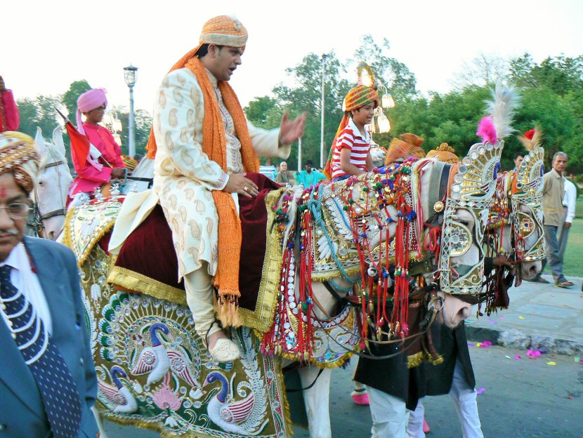Le mariage Rajasthani: Le futur marié, vêtu comme un maharajah, est monté sur un cheval blanc. Encadré par de longues rangées de lustres portées à bout de bras, toute sa famille et ses amis dansent devant la lente procession sur des musiques traditionnelles très rythmées. Le cortège se dirige vers le lieu de la cérémonie nuptiale ou l'accueille sa future épouse et sa famille. Il se déplace sur la voie publique au milieu de la circulation. Coincés dans l'embouteillage, cliché pris du car sur le vif.
