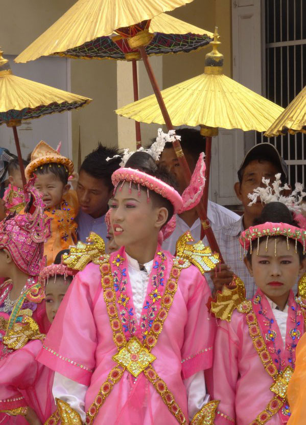 Birmanie (Myanmar), Mandalay, Mars 2016. Jeunes gens costumés, destinés à devenir novices. Entre 5 et 15 ans, ils entrent au monastère comme samanera (novice), c’est un évènement très important pour eux et leur famille. Les parents célèbrent l’évènement de manière extravagante : l’enfant est vêtu d’habits princiers en satin, maquillé, paré de bijoux.