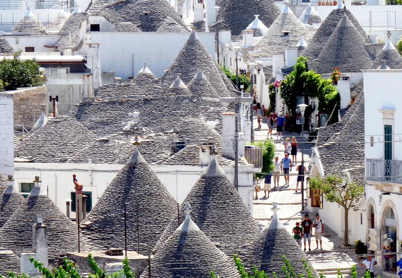 Région des pouilles en Italie du sud. qu'il fait bon de flâner dans les ruelles d'Alberobello au milieu des trulli, ces drôles d'habitations en pierre sèche. Ce sont des exemples remarquables de la construction sans mortier, technique héritée de la préhistoire et toujours utilisée dans la région. Les habitations surmontées de leurs toits pyramidaux, en dôme ou coniques, sont construites avec des galets de pierre à chaux ramassés dans les champs voisins.le site est classé au patrimoine mondial de l'UNESCO en tant qu'exemple d'une forme de construction héritée de la préhistoire, et qui a survécu intacte sans cesser d'être utilisée jusqu'à la période actuelle.