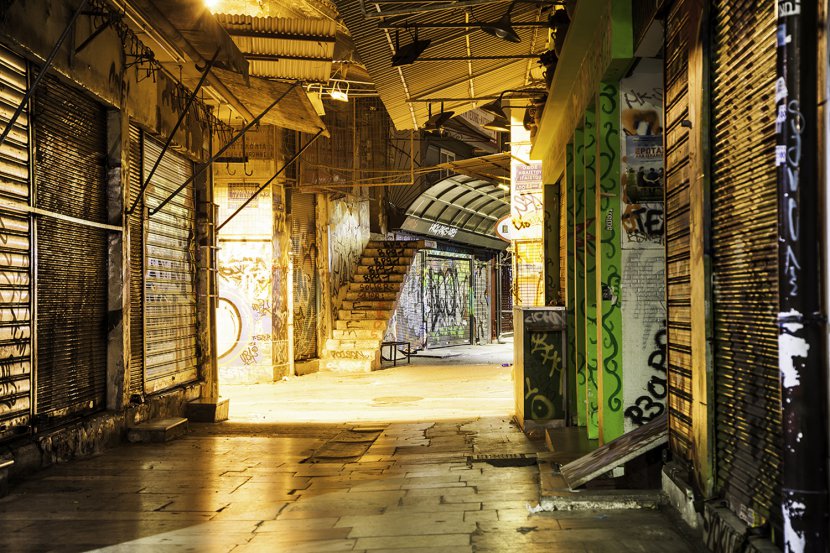 Voici une vision différente des clichés Grecs proposés, plus trash et en même temps paisiblement libérées du tumulte capitalesque. C'est une des nombreuses ruelles commerçantes du quartier de la Plaka situé au pied de l'Acropole à une heure où la lumière artificielle inonde l'espace abandonné par les badauds. Athènes (berceau de la démocratie), Grèce.