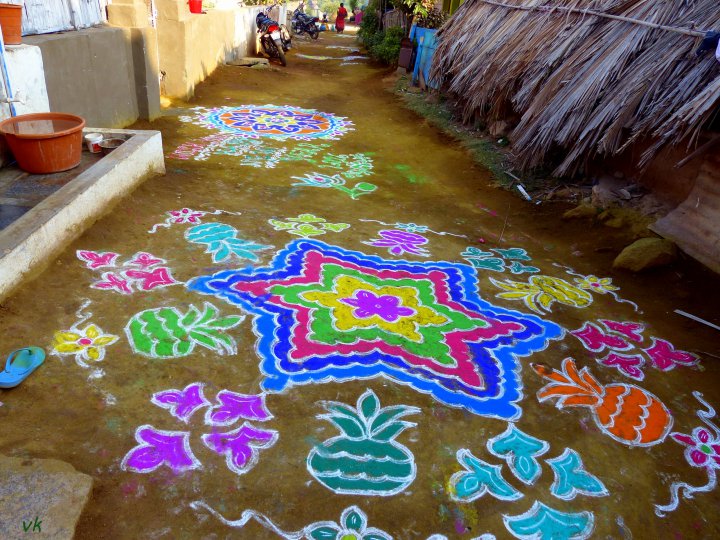Une ruelle de Hampi (Inde du Sud), au matin du 1er janvier. Les femmes ont passé une partie de la nuit à recouvrir la terre des rues du village d'un mélange de bouse de vache et d'eau,pour purifier le sol, puis ont dessiné devant chaque maison les traditionnels kolams destinés à apporter chance, bonheur et prospérité sur le domicile.Il y en avait un nombre incroyable, mais si éphémères!